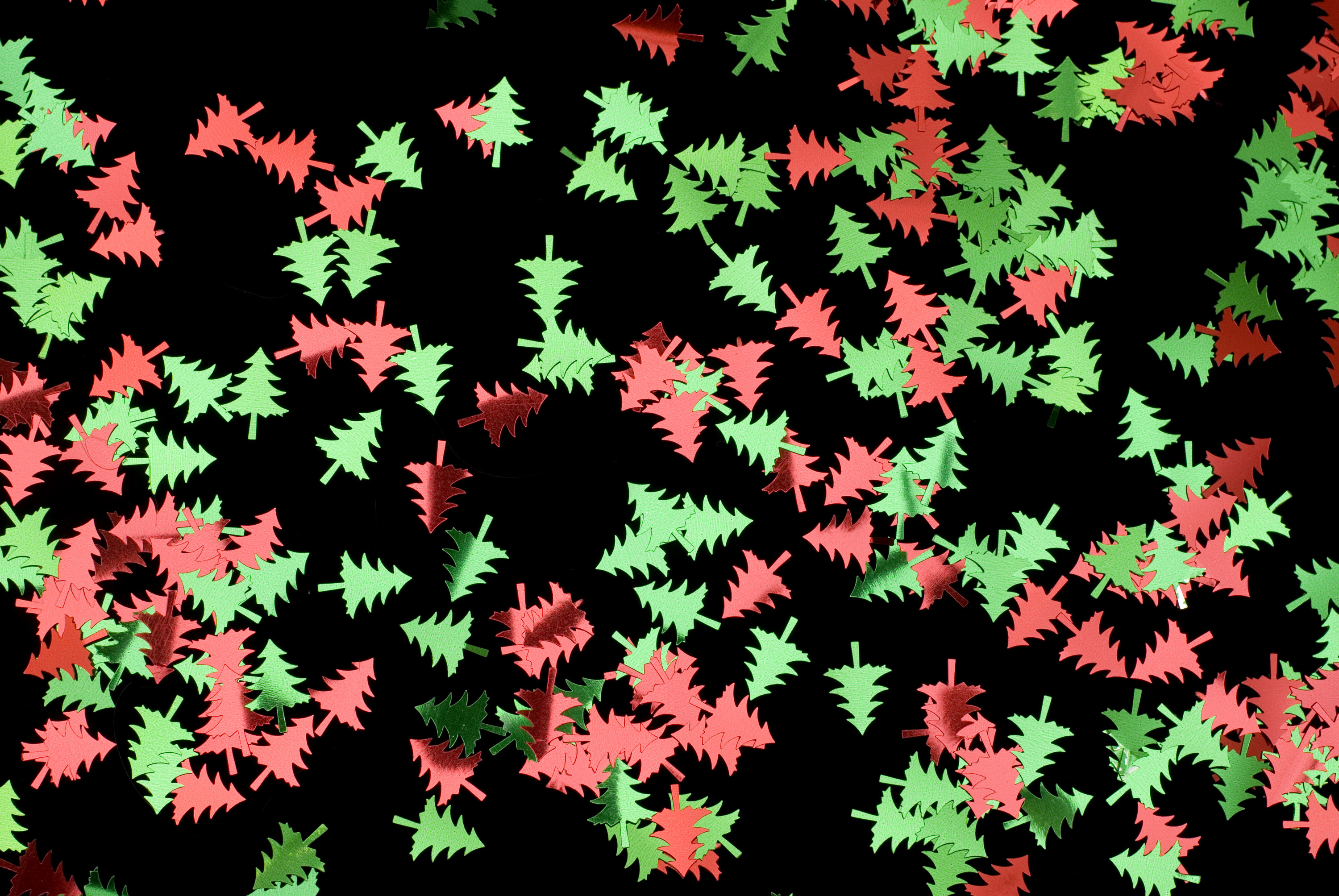 christmas festive seasonal holidays celebration xmas tree confetti shape metallic glitter shapes scattered backdrop background black shiny red green