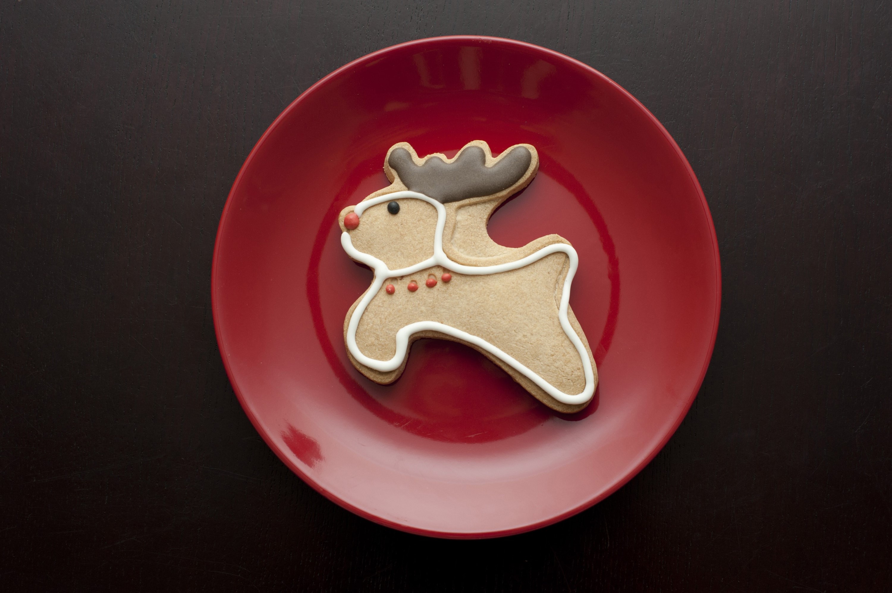 christmas holiday seasonal xmas bakery biscuit confectionery cookie decorated food gingerbread pastry red nose reindeer shape treat celebration party above leaping