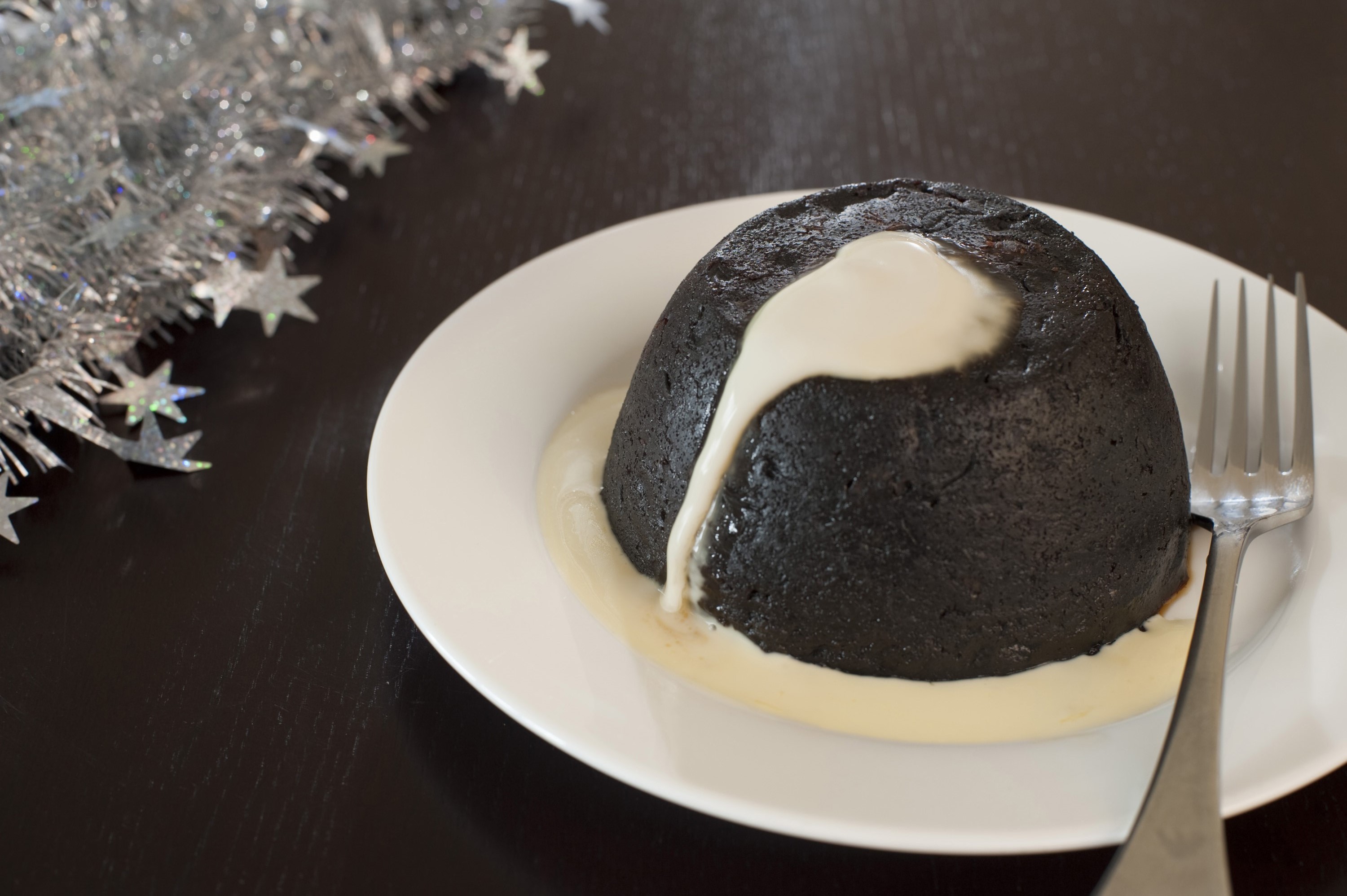 christmas festive season holidays celebration pudding plumb pudding dessert fruit pudding cake fork food eating dining brandy custard brandy sauce