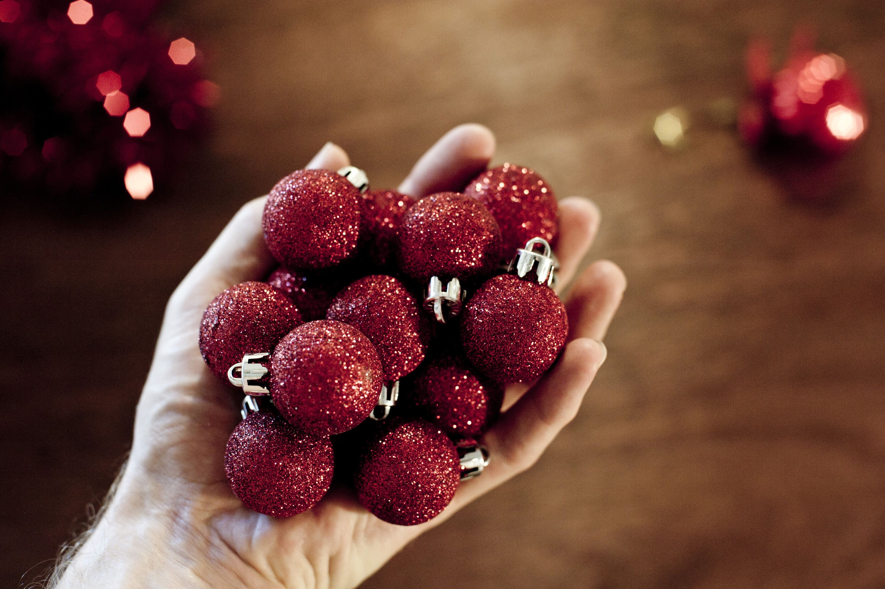 background celebration christmas christmas balls christmast tree decoration close up daylight hand heap holding holiday horizontal indoors many one palm person pile preparation preparing red several small sparkling unrecognizable wooden xmas