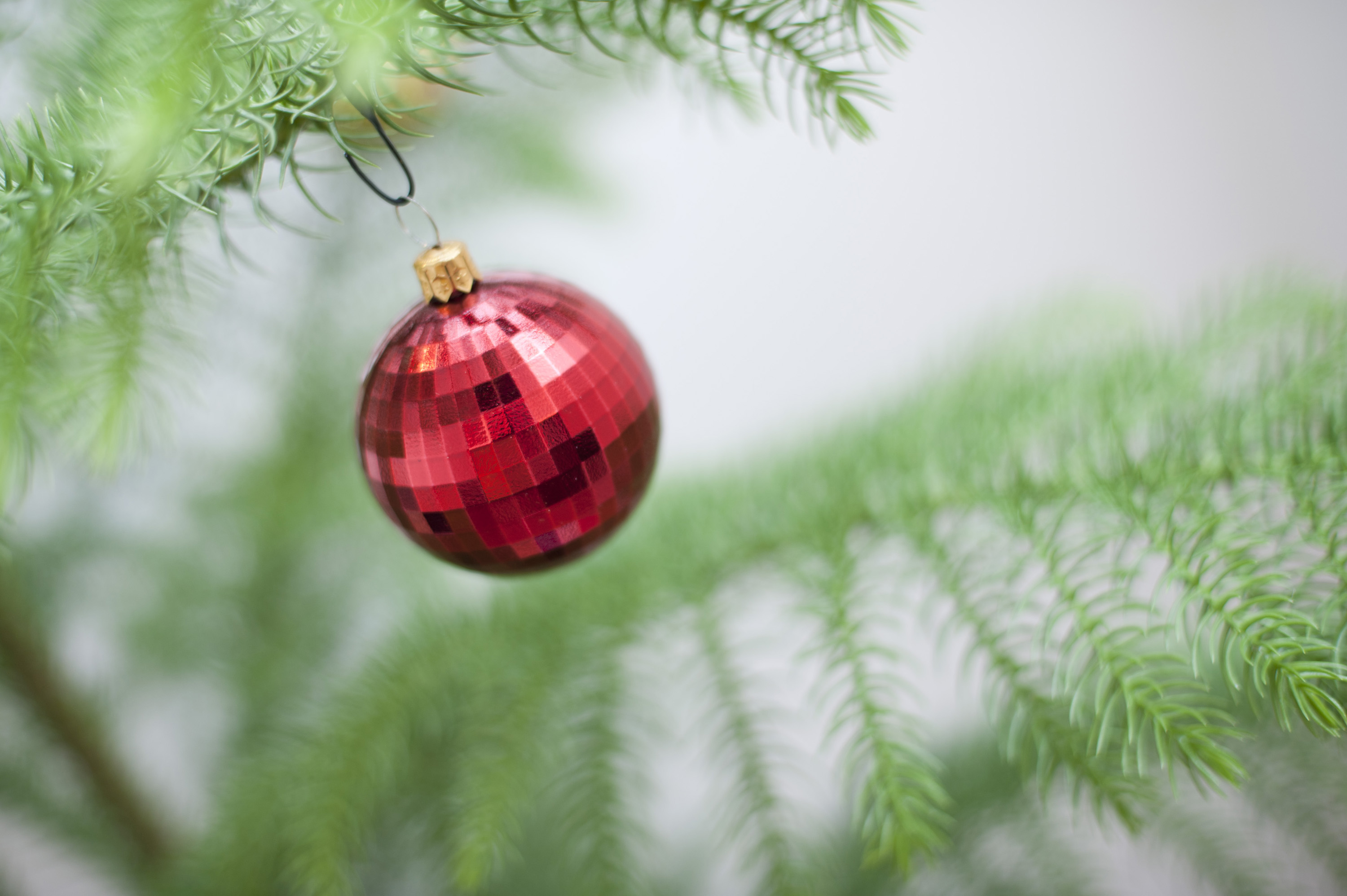 christmas xmas celebration copy space holiday natural pine red single tree bauble ball branches decorative ornament