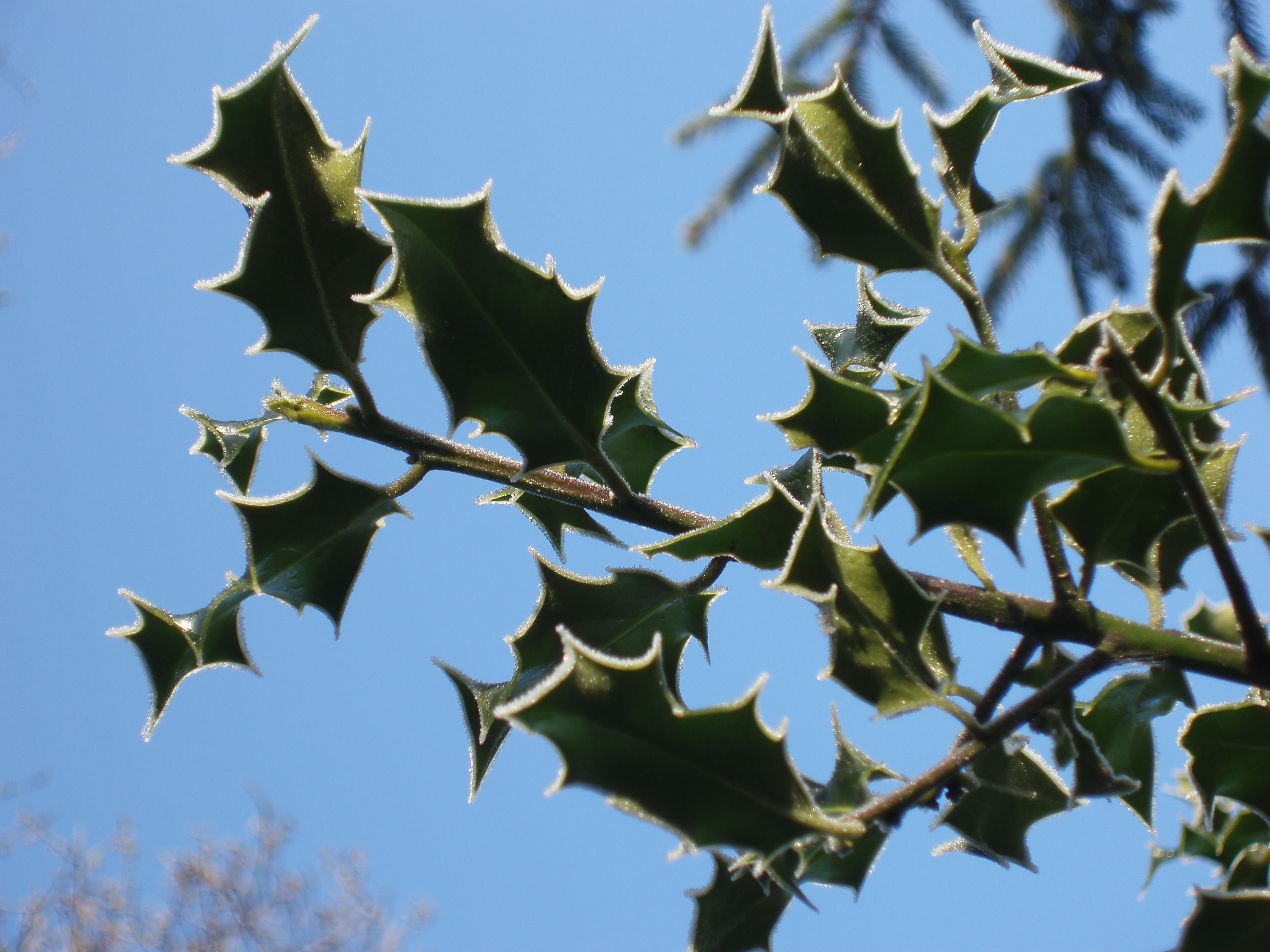 holly bush plant green sharp pointed nature frost frostng cold sky day winter christmas seasonal prick tree